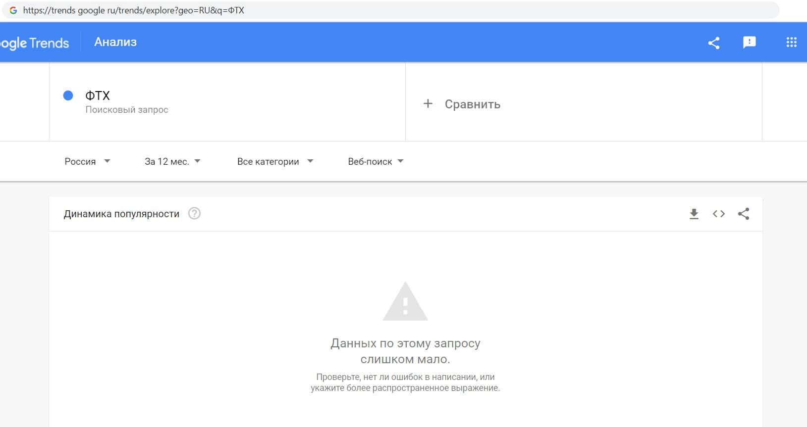 Далее мы проверили количество запросов финансовых кидал FTX по русскоязычному названию фирмы, а именно "ФТХ". Данный запрос пользователи не совершали целый год.