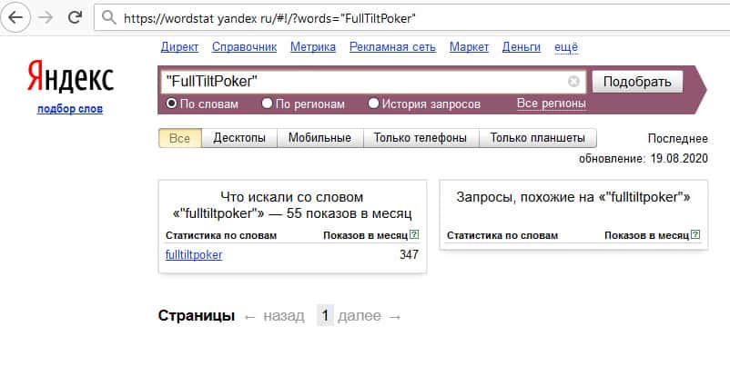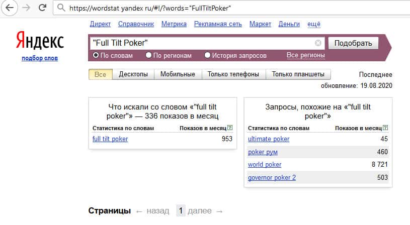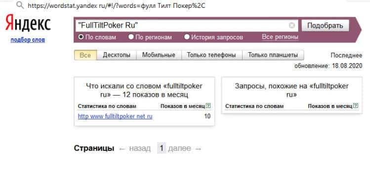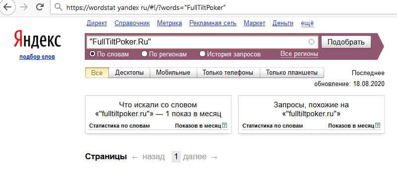 Если вы введете название сайта мошенников "Фулл Тилт Покер" в поисковике Яндекса, то обнаружите, что его искали более 600 раз в месяц.