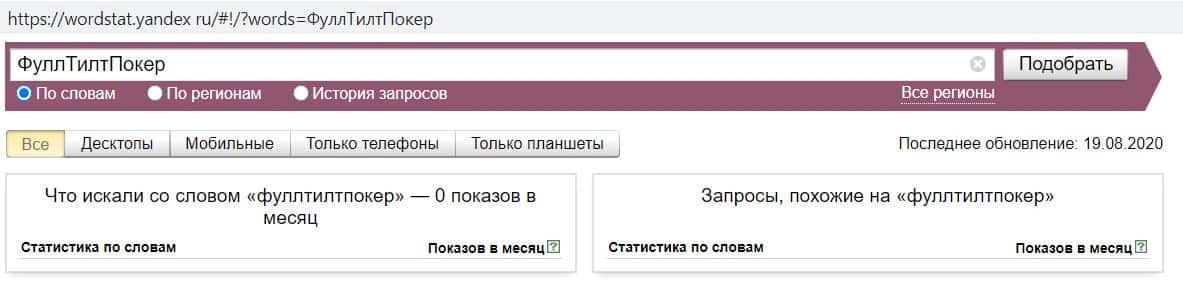 Раздельное написание в Яндексе названия домена "Full Tilt Poker" на английском показывает, что более 300 человек могут попасть в лапы этой конторы за ежемесячно.