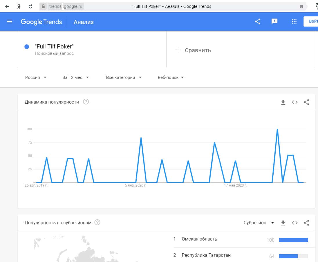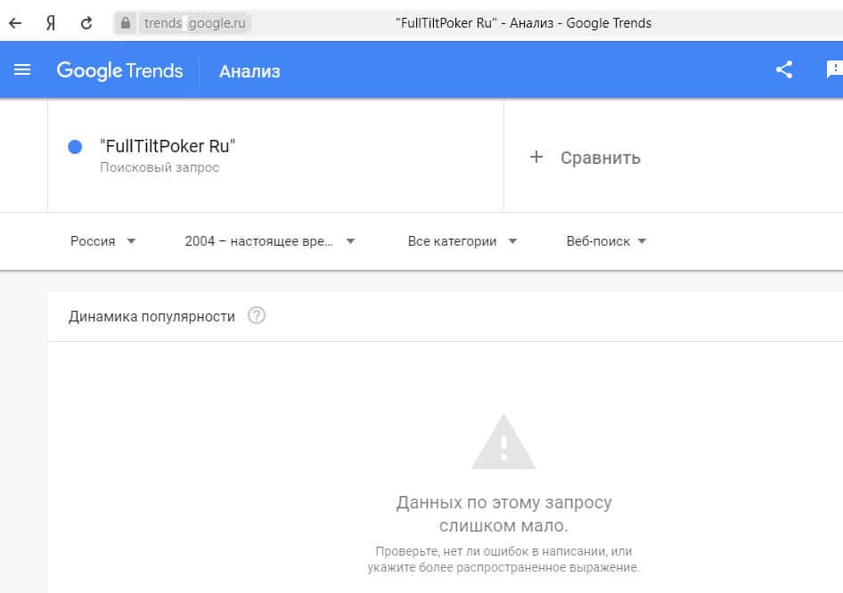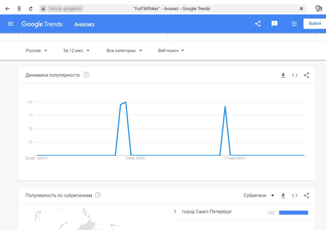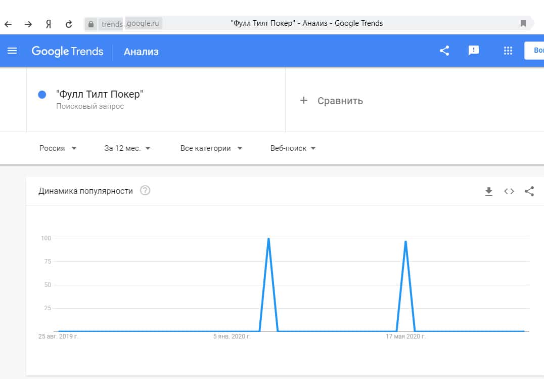 Если предложить поисковику сокращенный вариант названия "FullTiltPoker", можно наткнуться на два всплеска активности пользователей в мае этого года, но небольшие.