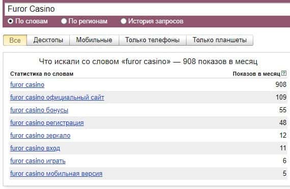 Также запросы в Яндекс по бренду "Furor Casino" набрали 908 показа за месяц. Показатели средние, но особо опасности не несут.