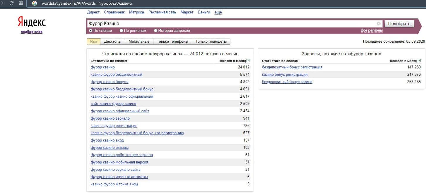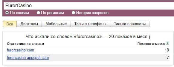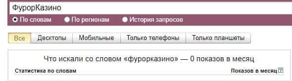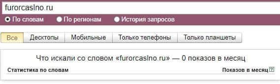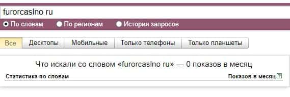 Если взять и пробить в Яндекс.Вордстат чисто домен сайта без точки "furorcaslno ru", то система выдает нам 0 показов в месяц.