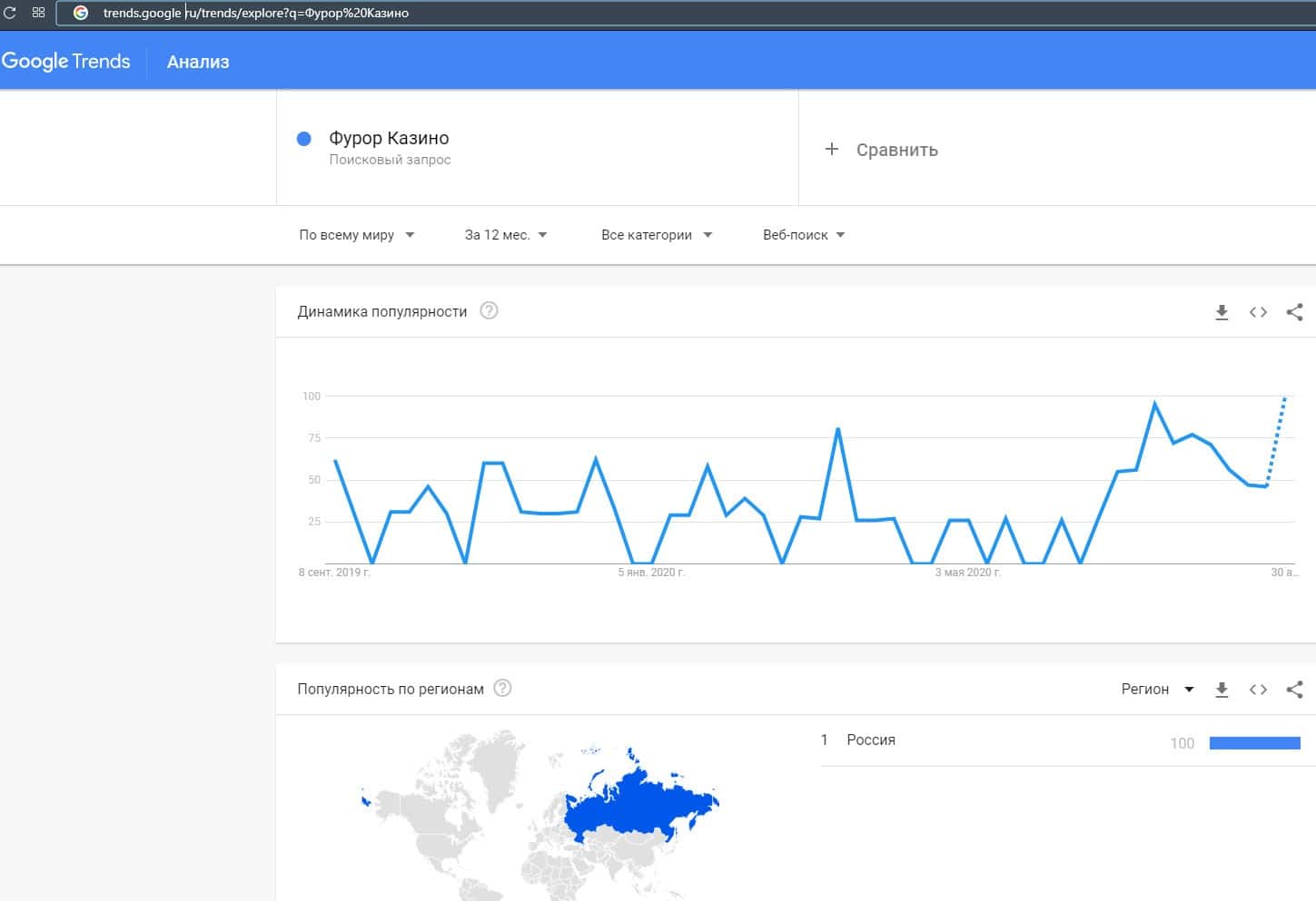 Согласно бренду "Фурор Казино" контора в поисковой системе Гугл была показана достаточное количество раз и в основном запросы идут из России.