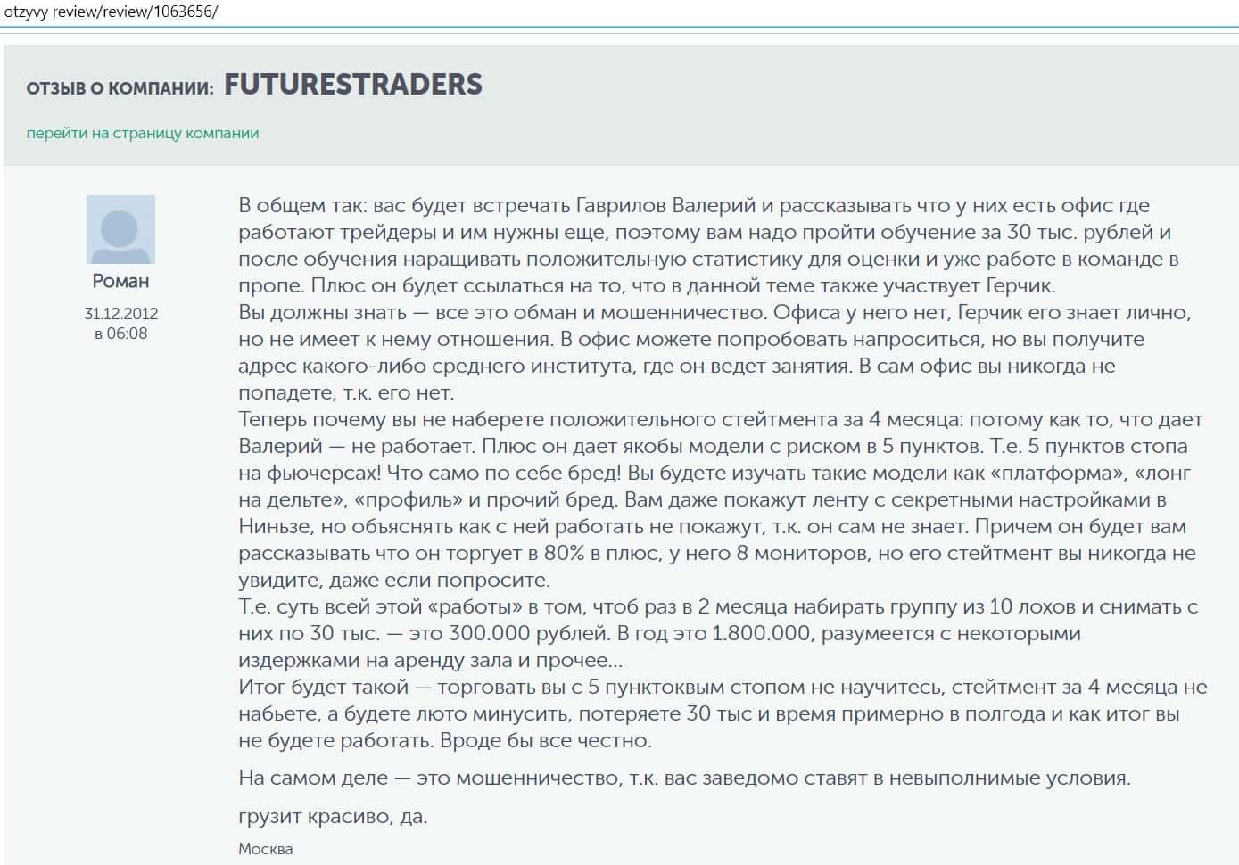Роман написал в своем отзыве, что школа трейдинга Футурес Трейдерс - это обман и мошенничество. С людей попросту берут деньги, а учить их никто не собирается.