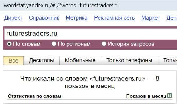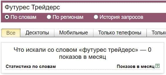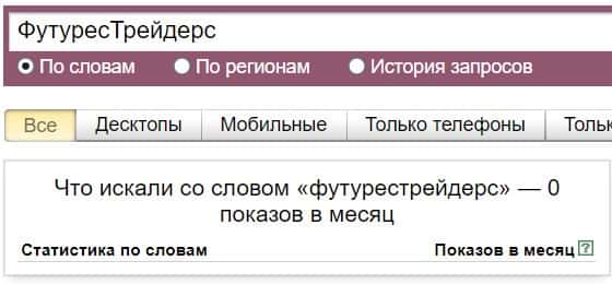 Название бренда на русском языке без пробела "ФутуресТрейдерс", пользователи также совсем не искали в системе Яндекс.