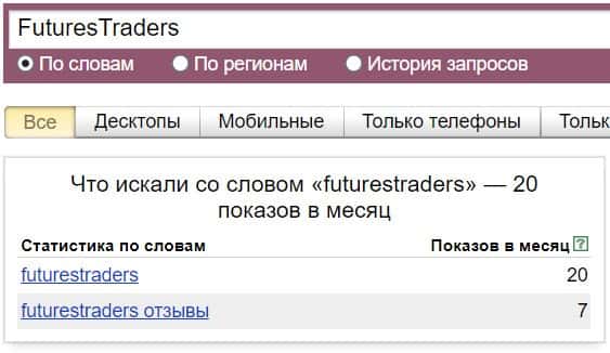 Название мошеннической конторы "FuturesTraders", написанное на английском языке, пользователи искали в системе Яндекс 20 раз за месяц.