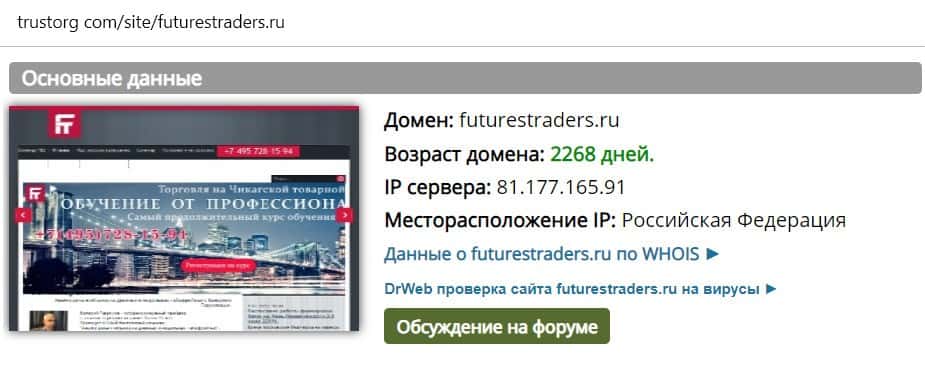 Возраст доменного имени сайта futurestraders ru составляет 2268 дней. Однако, это уловка мошенников, которые купили чужой домен, чтобы подделать возраст своей конторы.