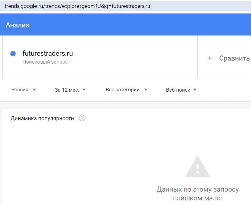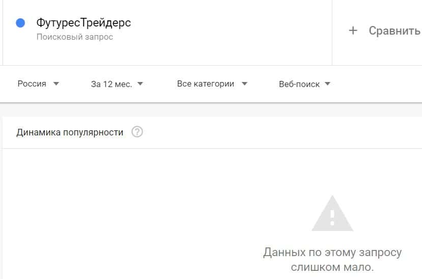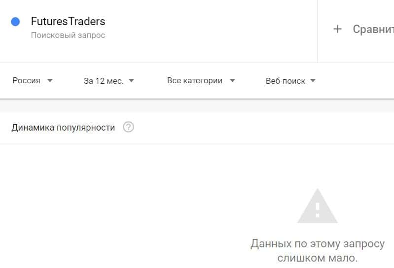 Посмотрим, насколько популярно название бренда "FuturesTraders", написанное на английском языке. Данных по этому запросу нет, так как никто не искал этот бренд в Гугл.