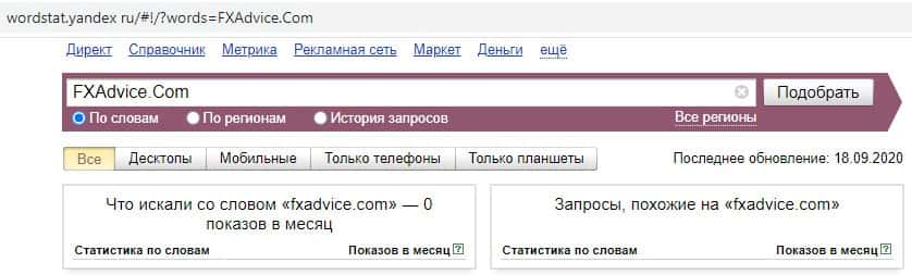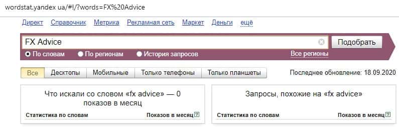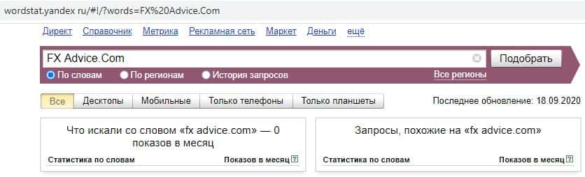Начинаем с запросов на английском языке. Первый запрос в Яндекс на английском "FX Advice" выдает 0 показов в месяц. Так информацию о мошенниках никто не ищет.
