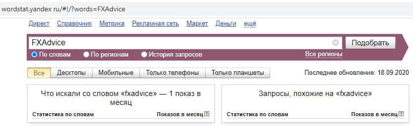 Второй запрос в яндексе на английском языке без пробела "FXAdvice" без пробела выдает уже 1 показ в месяц.