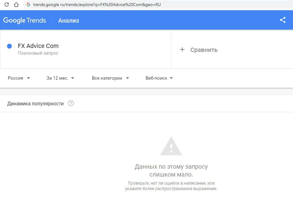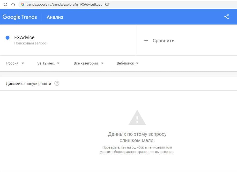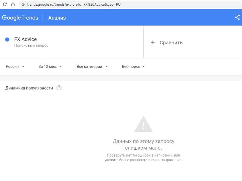 Такой же запрос на английском языке только с одним пробелом "FXAdvice Com" выдает результат, как и в предыдущем случае - 0 показов в месяц. Так информацию о них не ищут.