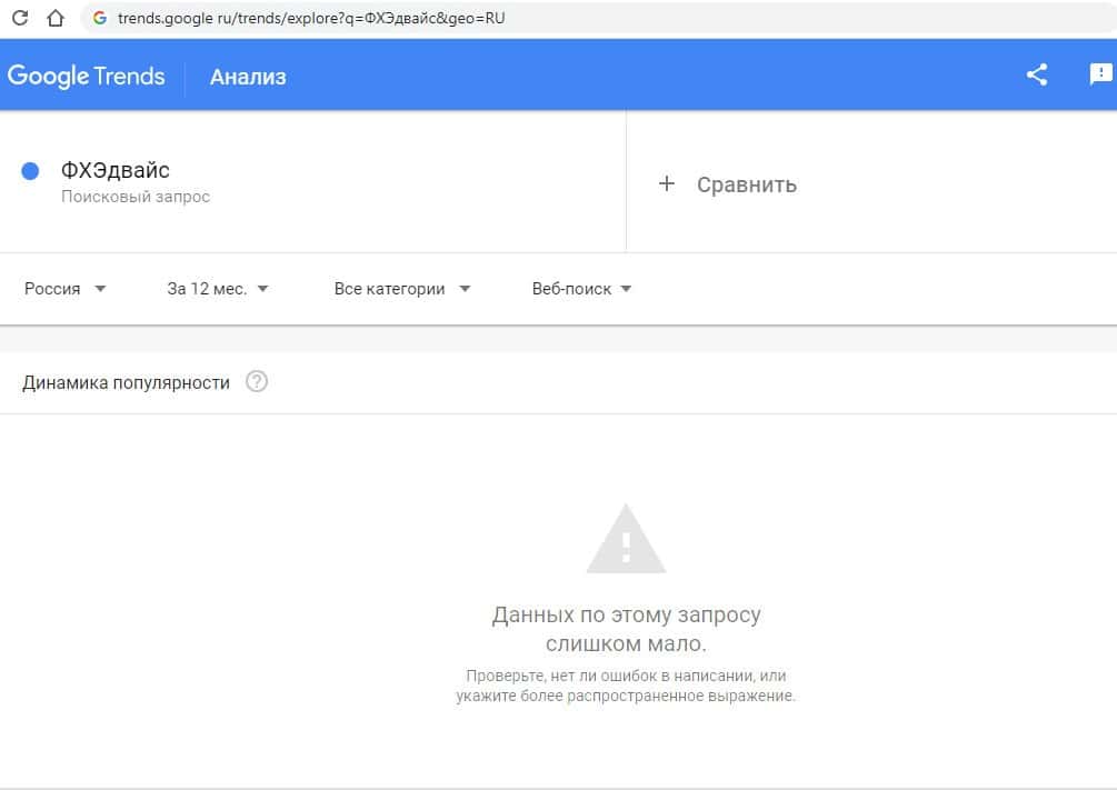 И последний запрос в Гугл на русском языке без пробела "ФХЭдвайс" выдает результат в 0 показов в месяц. По такому запросу информацию о мошенниках тоже никто не ищет.