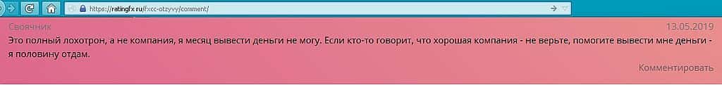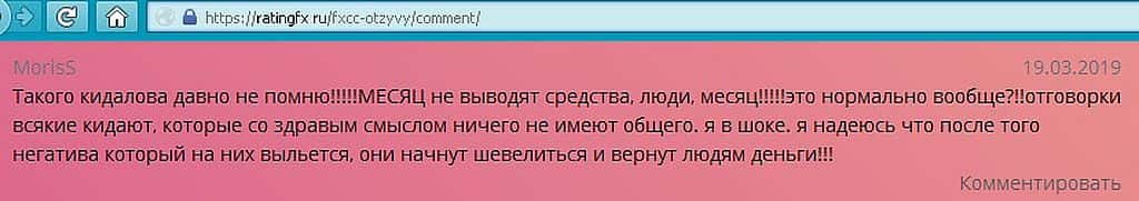 Даже если вам удастся заработать, аферисты FXCC не вернут ваши деньги! При попытке вывода они начинают лепить нелепые отговорки и кормить трейдеров завтраками. Со временем перестают реагировать на звонки и сообщения, надеясь, что жертва просто смирится с потерей. Обманутые трейдеры делятся опытом на веб-ресурсе ratingfx ru.