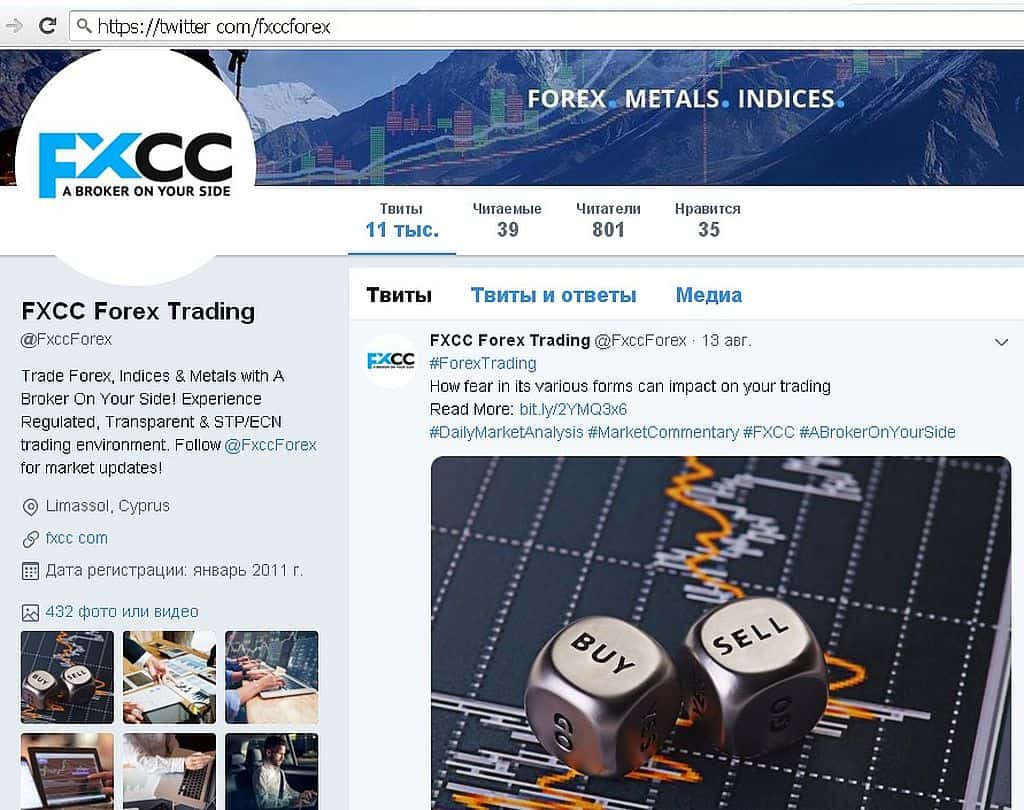 "Брокер, который на твоей стороне" - лозунг скаммеров FXCC. Он, как и страницы в соцсетях, призван заморочить трейдерам голову. Опытные биржевые игроки сразу понимают, с этой конторой лучше не связываться. Страничка в Твиттере не так популярна и полностью повторяет контент профиля на Фейсбук.