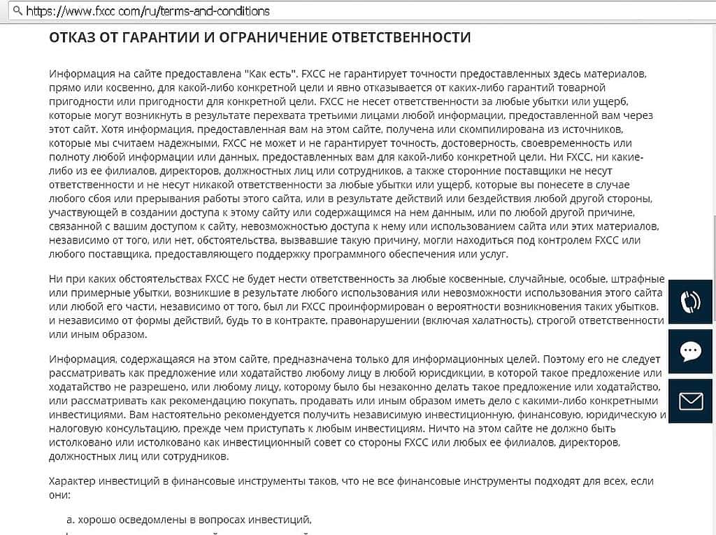 Согласно информации на сайте, контора FXCC не предоставляет никаких гарантий сохранности и возврата средств, никак не отвечает за достоверность финансовой информации. Это черным по белому прописано в условиях сотрудничества, которое кидалы FXCC подсовывают вместо клиентского соглашения.