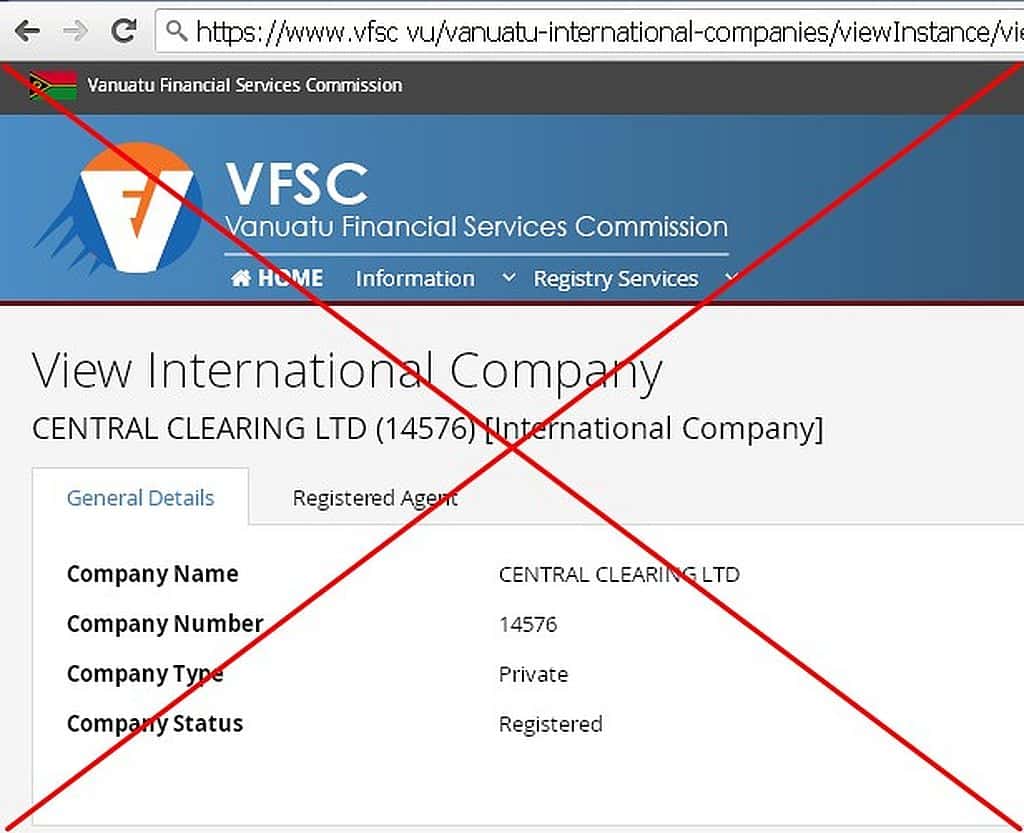 Кидалы FXCC имеют лицензию, выданную комиссией по финансовым услугам Вануату под номером 14576. Проверяем, действительно, под этим номером зарегистрирована контора Central Clearing LTD. Только это не значит, что у них есть разрешение на биржевую торговлю! Вануату таких свидетельств не выдает, просто вносит компании в реестр.