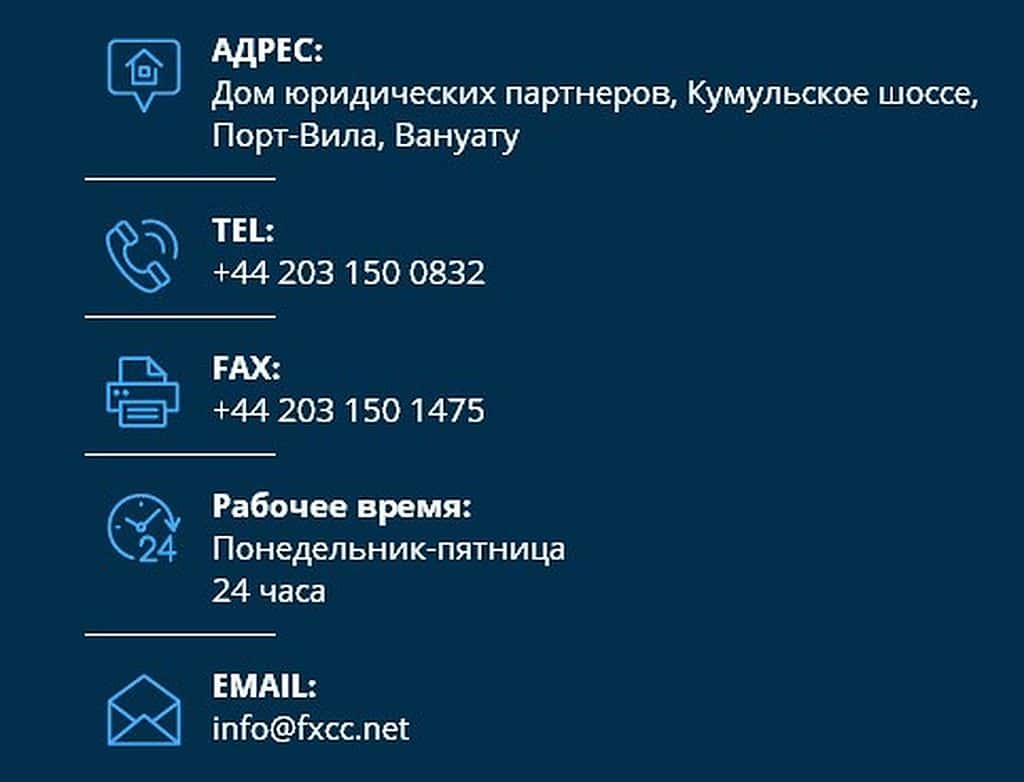 Лохотронщики FXCC обещают жертвам круглосуточную многоязычную поддержку. Для этого на сайте есть форма обратной связи и чат. Правда, на вопрос о выводе средств вы ответа все равно не получите. Предоставляют они и другие данные, в том числе адрес официального офиса, который находится в оффшоре. Контакты жуликов: