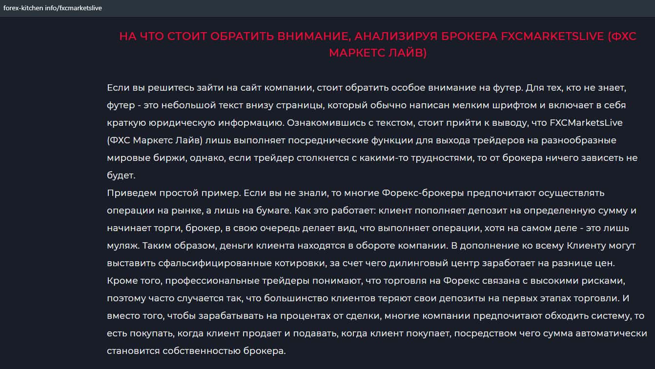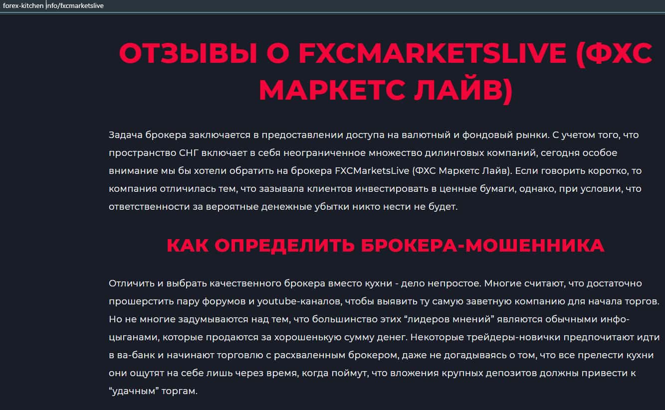 Статья-обзор мошеннической конторы FXCMarketsLive