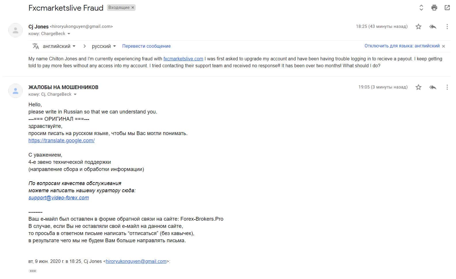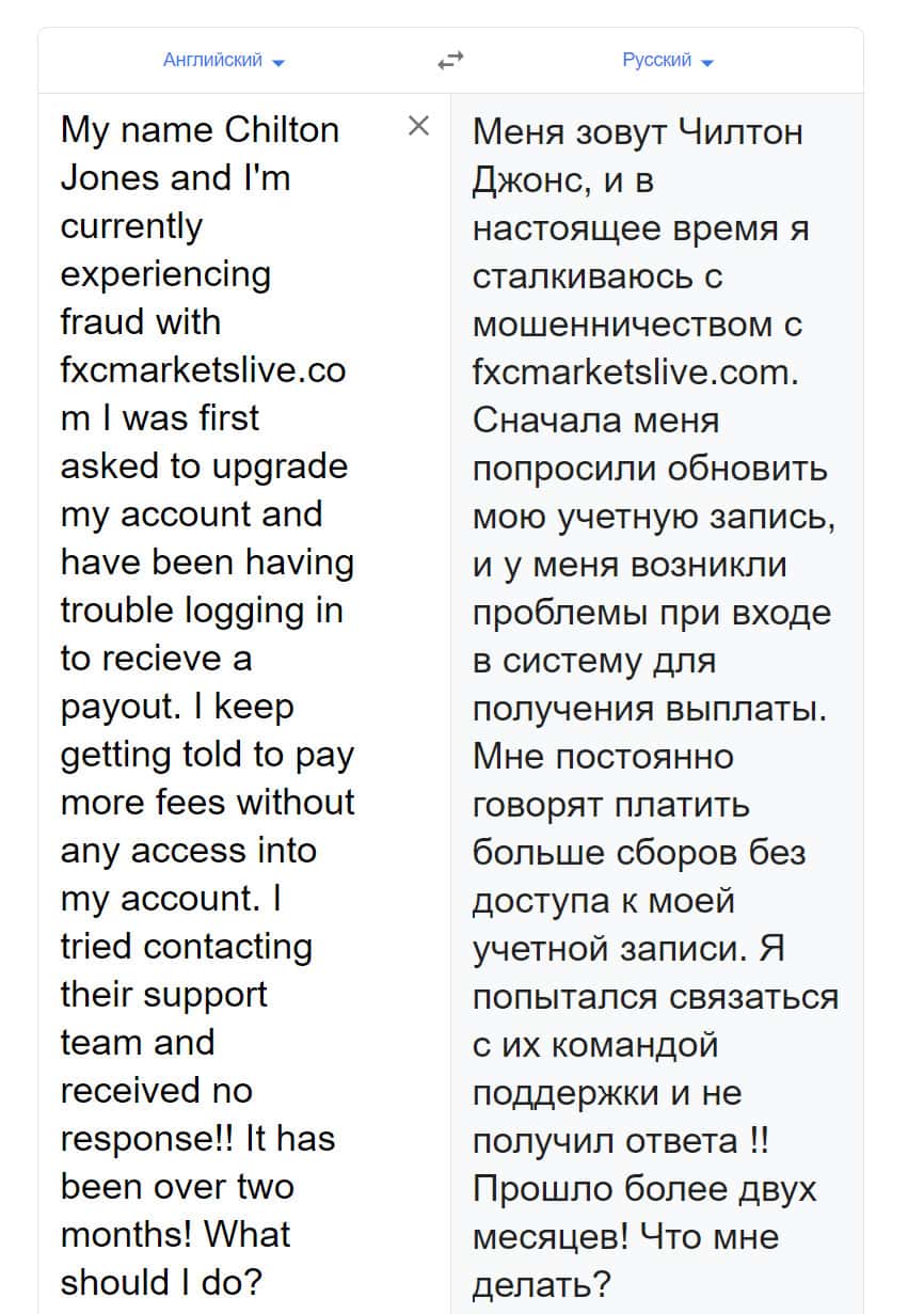 Через онлайн-переводчик текст письма с жалобой на форекс-лохотрон FXCMarketsLive был переведен на русский язык.