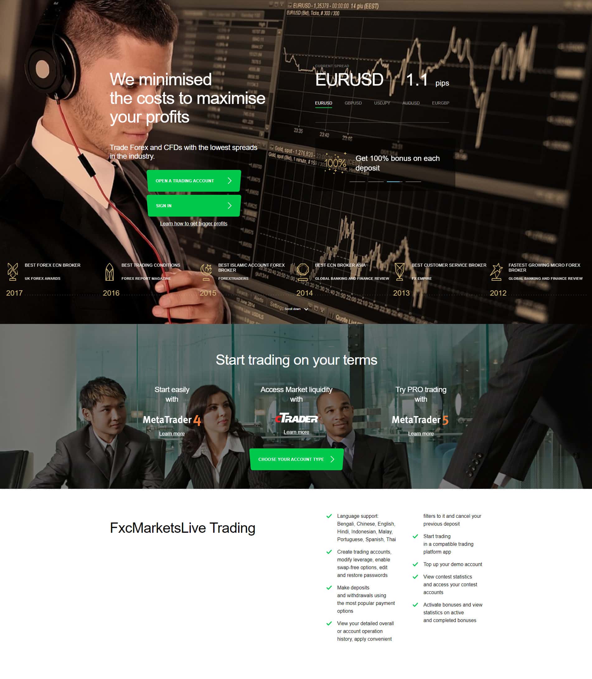 Ну и конечно же некоторые данные о торговой платформе cTrader, которая подойдет для трейдеров, которые развиваются. Здесь также идет вход от 100 долларов и лохотрон FXCMarketsLive много с этого не поимеет. И все же не стоит рисковать и связываться с лохотронщиками ФХС Маркетс Лайв.