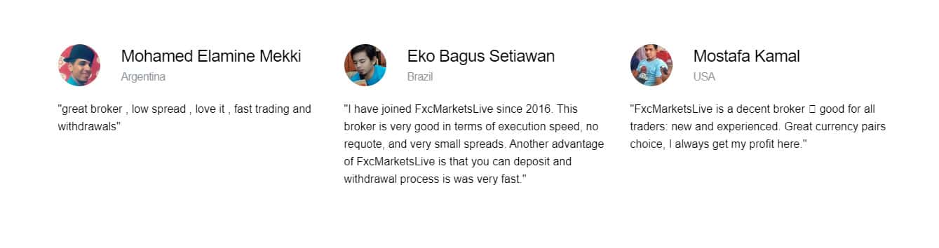 На сайте лохотронской организации FXCMarketsLive нам удалось найти отзывы от якобы реальных клиентах, которые хвалят работу с мошенниками ФХС Маркетс Лайв. Это довольно интересная информация, так как все эти персонажи выдуманные, и тексты отзывов шаблонные, так что не стоит во все это верить.