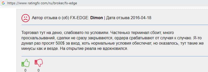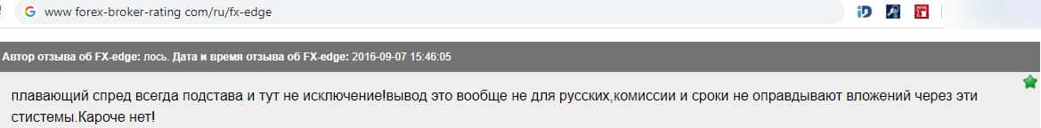Клиент сообщил в своем отзыве о том, что проходимцы из липовой компании FX-EDGE создали несмотря на немалый платный вход в размере 500 долларов, нормальные условия для заработка. Но это было ложью: терминал сбит; ордера срабатывают время от времени; постоянные проскальзывания. В общем, не работа, а сплошное мучение.