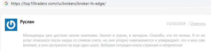 На нижеуказанном скриншоте можно ознакомиться с отзывом недовольного пользователя постоянными звонками от сотрудников шулерской конторы FX-EDGE, которые не оставляют человека в покое, хотя он ясно дал понять, что не желает иметь никаких дел с ними. Но они упорно навязываются и требуют продолжения вкладывания денег.