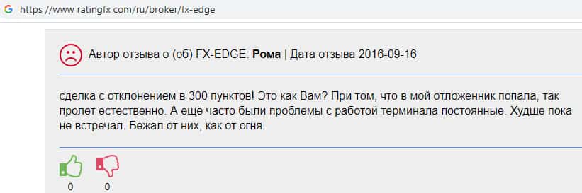 Форекс пользователь сообщил об ужасно невыгодных условиях торговли на платформе мошеннической компании FX-EDGE: сделки происходят с отклонениями в 300 пунктов; постоянные проблемы возникают с работой терминала; задержки случаются на постоянной основе с выводом собственных средств с торгового счета.