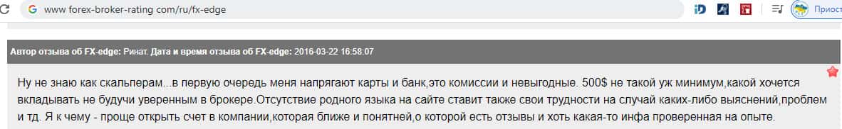 Мужчина поделился своим мнением о работе и условиях, которые предлагает для всех своих пользователей аферный дилер ФХ-ЭДЖ: невыгодные комиссии, слишком большой размер минимального депозита в размере 500 долларов, отсутствие русского языка и так далее. В общем, он советует обходить подобные некомфортные конторы, как FX-EDGE.