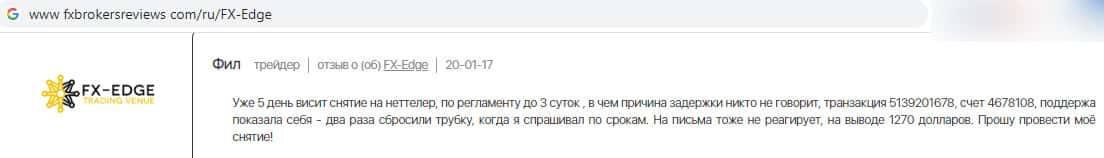 На изображении, расположенном ниже подробно расписан случай предположительного кидалова на деньги своего трейдера брокером ФХ-ЭДЖ. Мужчина поведал, что совершил заявку на вывод со счета 1270 долларов. Но заявка висит, а служба поддержки сбрасывает все его звонки и не реагирует никаким образом. Видимо, возврат денег маловероятен.