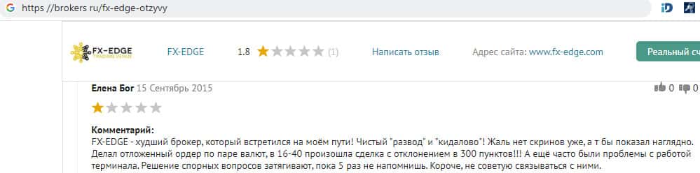 При обзоре уважаемого веб-сервиса brokers ru о жульнической форекс дилере FX-EDGE, сотрудники платформы пришли к закономерному выводу о том, что они ни в коем случае не рекомендуют потенциальным вкладчикам, если они не желают пожертвовать средства в эту шарагу, открывать у них торговый счет. Они поставили им из пяти возможных баллов оценку 1,8.