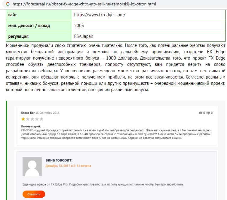 - Подробный обзор аферистов из шарашкиной брокерской компании FX-EDGE известным порталом forexareal ru