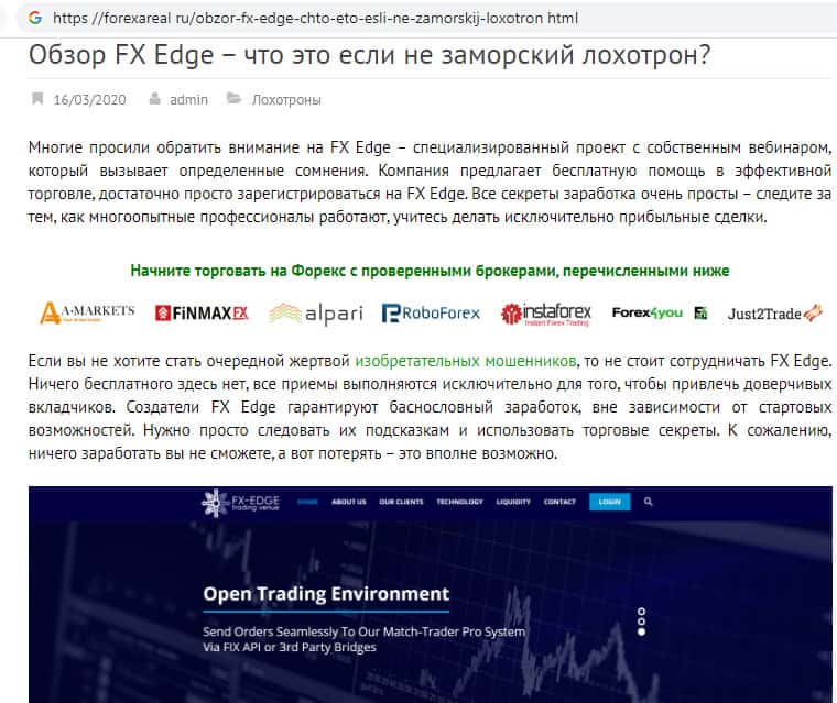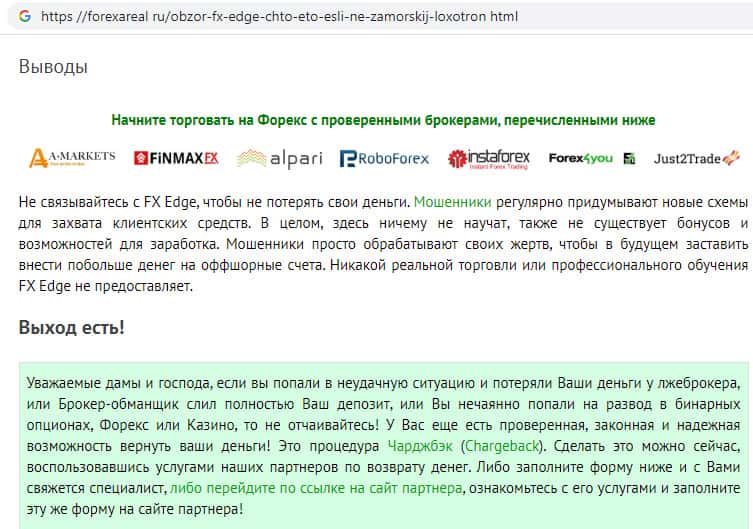 Подробный обзор аферистов из шарашкиной брокерской компании FX-EDGE известным порталом forexareal ru
