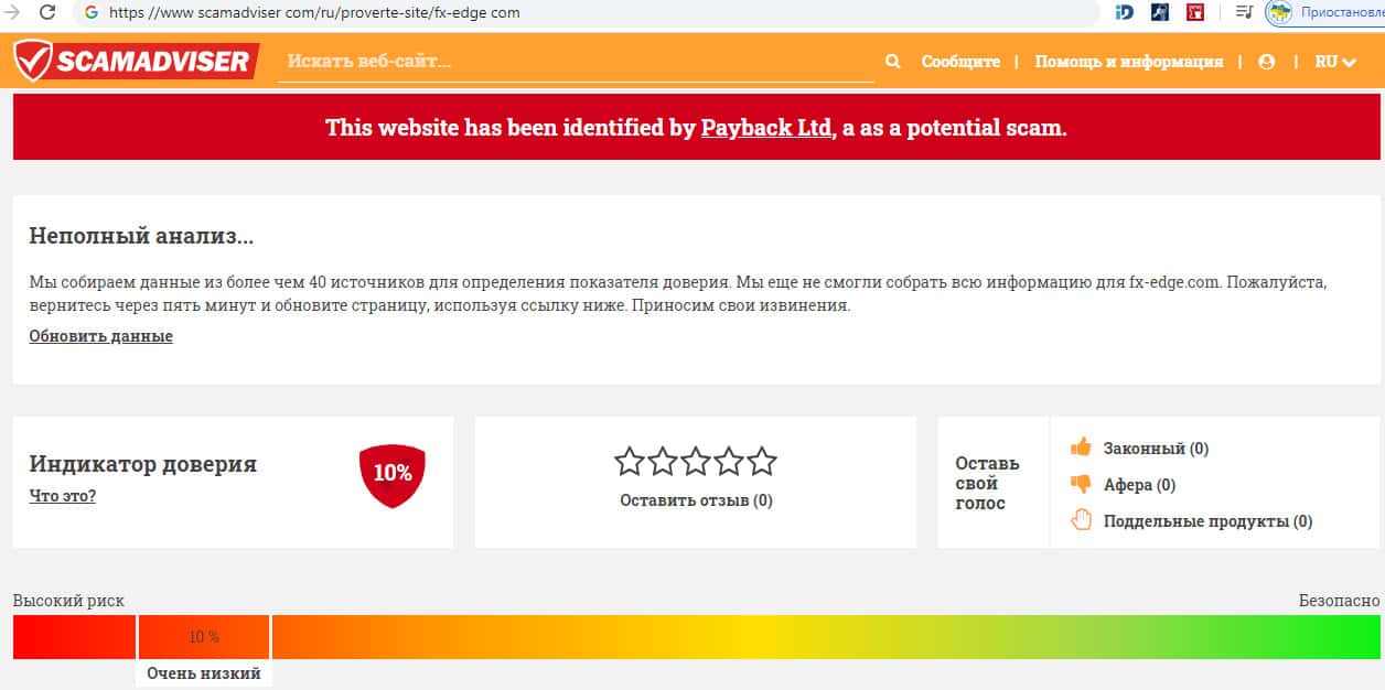 Уважаемый интернет-сайт scamadviser com предоставил при обзоре на домен шарашкиного портала ФХ-ЭДЖ поразительный результаты: индикатор доверия к данному веб-ресурсу составляет всего 10% из ста возможных. Также стало известно, что данный ресурс является потенциально скамом. Явно, нельзя доверять таким авантюристам, как данная шарага.