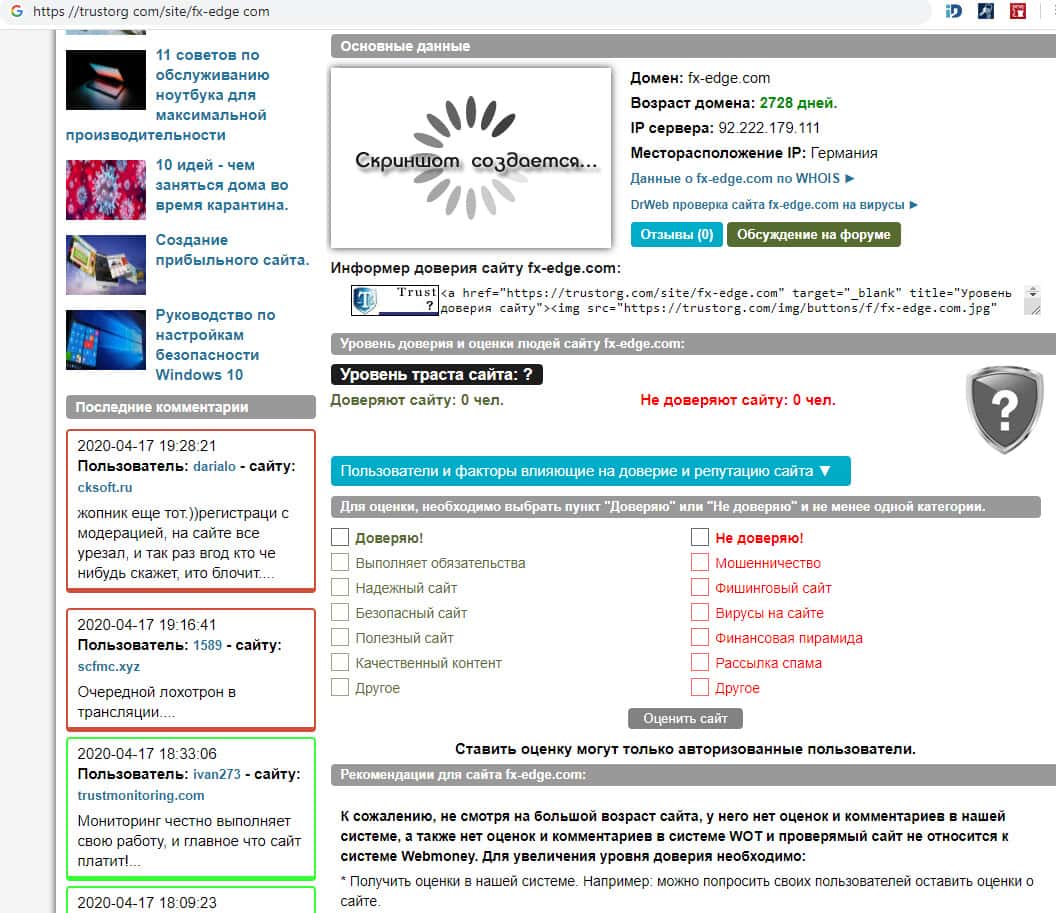 Что касается проверки домена воровской брокерской компании FX-EDGE, то мы там увидели следующее: возраст домена составляет 2728 дней с место расположения в Германии. Удивительное лишь то, что несмотря на солидный возраст ресурса, у него нет оценок и комментариев в нашей системе. Такое вызывает подозрения в мошенничестве данного брокера.