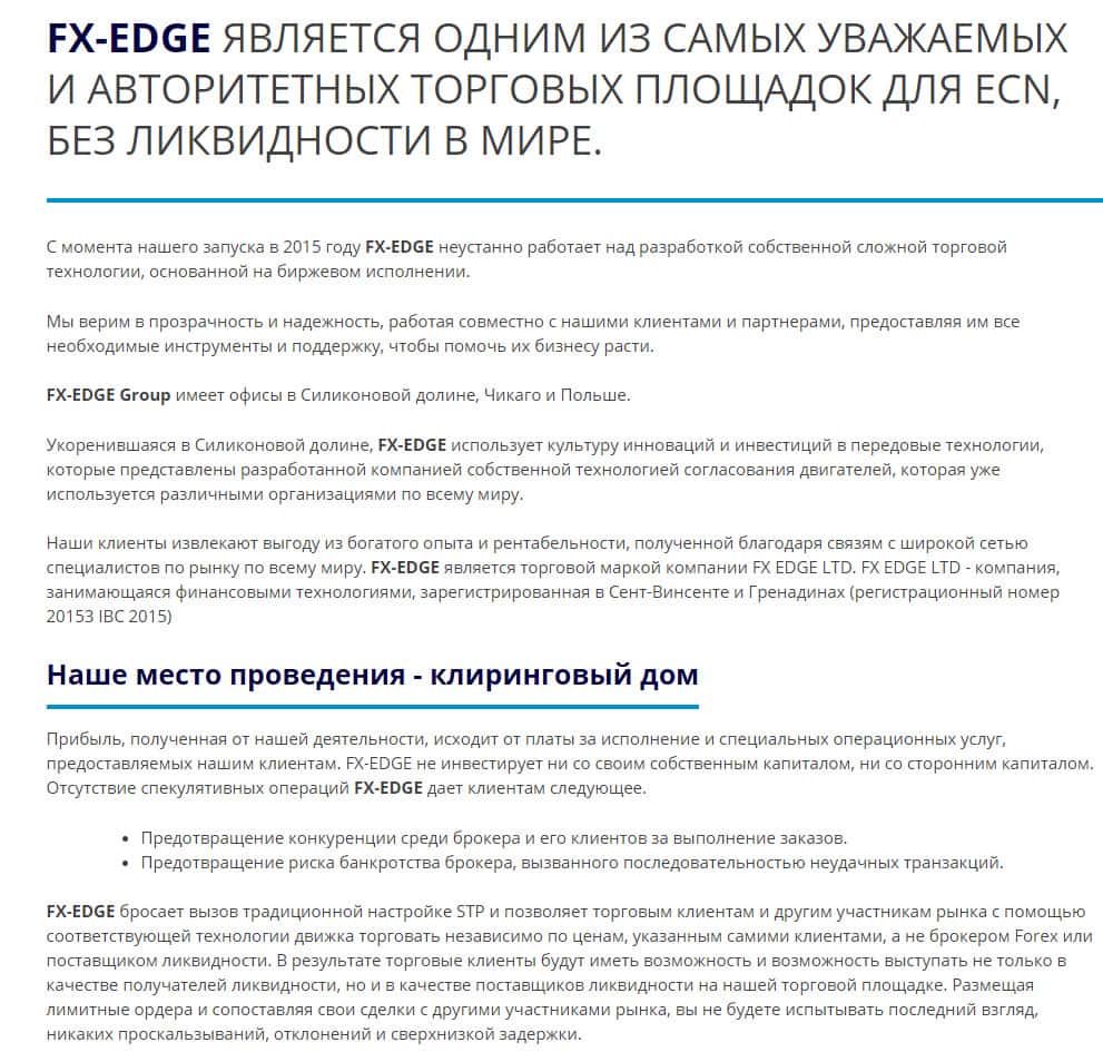 Следующий раздел интернет-страницы махинаторов ФХ-ЭДЖ "О нас" посвящен уверениям потенциальных пользователей в том, что данная компания является одной из наиболее уважаемых и авторитетных торговых площадок для ECN, без ликвидности в мире. Но уйма негативных отзывов и жалоб в сети интернет свидетельствует об обратном.