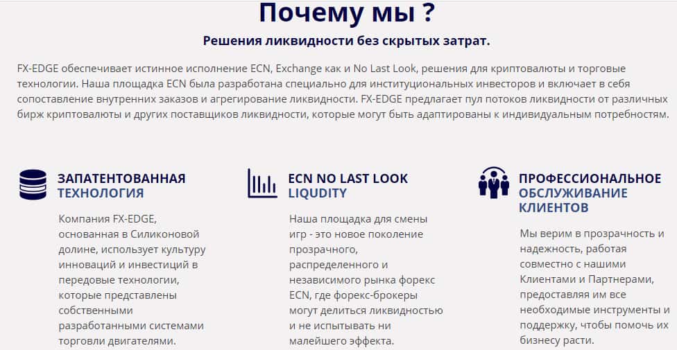Первый раздел веб-портала шулерской брокерской компании ФХ-ЭДЖ посвящен перечислению основных составляющих, почему именно их должен выбрать потенциальный вкладчик. Ворюги якобы предлагают запатентованную технологию, площадку для смены игр нового поколения и профессиональное обслуживание клиентов. По факту, сплошная ложь.