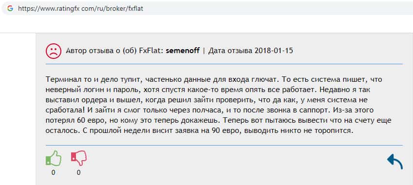 Недовольный клиент компании FxFlat пишет о том, что терминал жуликов очень сильно тупит, часто пишет что не подходит пароль или логин, но это сделано специально, так как после звонка в поддержку снова всё работает. Так из за таких махинаций клиент потерял 60 долларов, но когда решил вывести остальные, компания не позволила.
