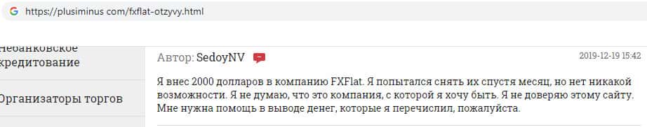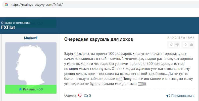Пользователь пострадавший от рук мошенника FxFlat написал отзыв о компании, и рассказал как жулики обманули его. Пользователь внёс 100 долларов, и толком не начав торговать, как сразу же ему начали названивать из компании, и заставлять увеличить депозит, но как только клиент решил забрать деньги, то мошенники заблокировали аккаунт.