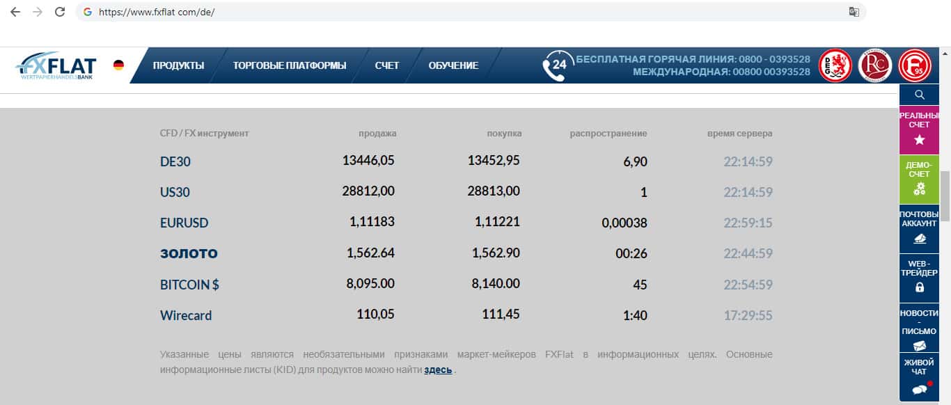 Далее следует таблица с ценами, но ценны указаны не верные, так как компания сама указывает, что указанные цены являются необязательными признаками маркет-мейкеров FXFlat. Всё это сделано для того, что бы трейдер посетив сайт и увидев цены захотел торговать с данным брокером, но потом его ждал бы неприятный сюрприз.