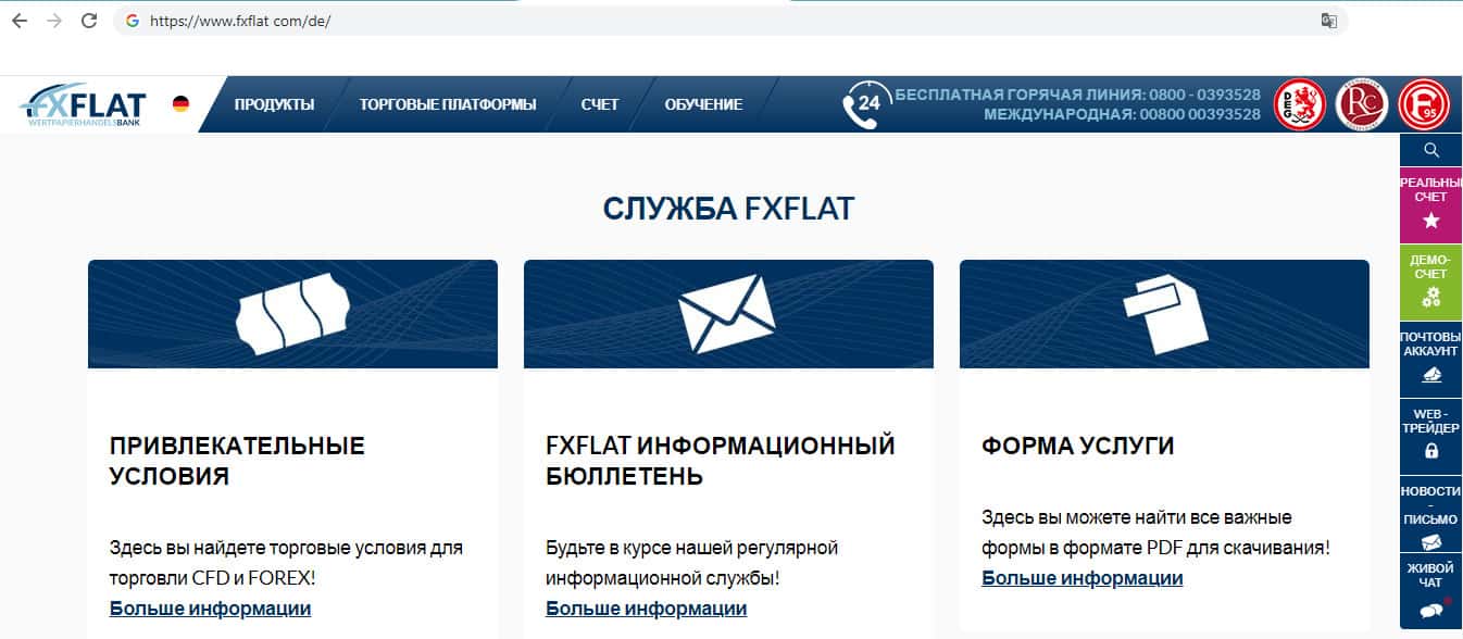 Следующим пунктом следует "Служба FxFlat". В этом пункте компания представляет свои якобы привлекательные условия, их можно просмотреть пройдя по ссылке, так же представлена информационная служба, там компания выкладывает информацию, для манипулирования трейдерам, форма услуг, где жулики представляют формы разных услуг.