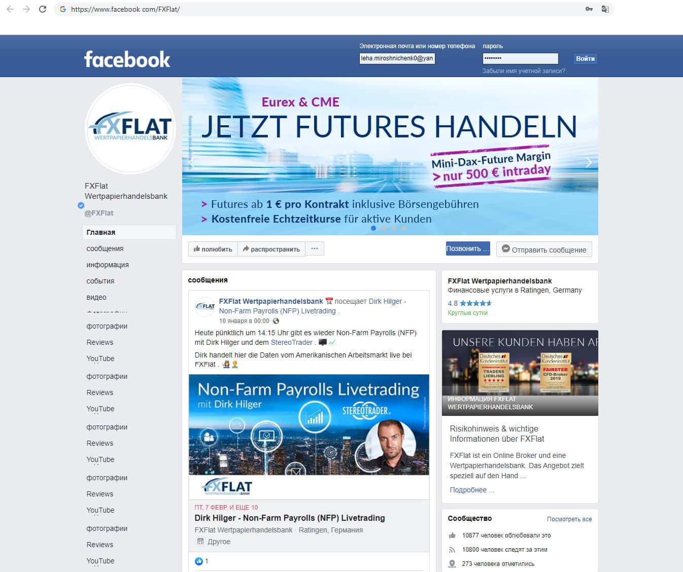Компания псевдоброкера FxFlat завели аккаунт в самой популярной социальной сети в мире - фейсбуке. Там они набрали более 10000 подписчиков, что является довольно большим количеством. На своей странице они пиарят свою компанию и пытаются завлекать новых клиентов в свою шарашкину контору.