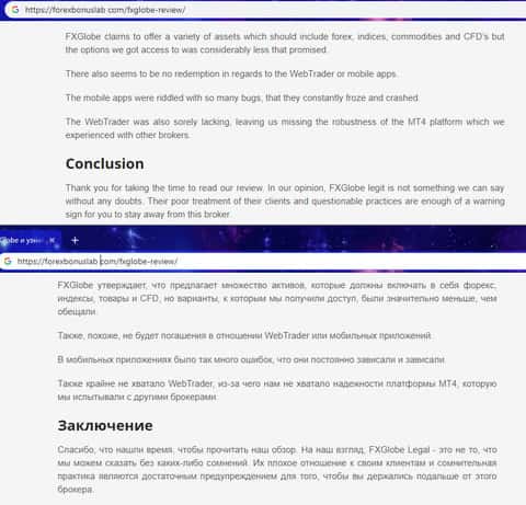 Помимо негативных отзывов англоязычных пользователей в сторону аферистов Фх Глоб, негативно о мошенниках высказываются англоязычные ресурсы, которые недовольны деятельность жуликов FxGlobe. На изображении, расположенном ниже, вы можете увидеть заключение сайта forexbonuslab com об аферистах сети интернет в лице мошенников Фх Глоб.