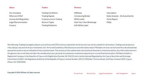 Завершается сайт лохотрона FxGlobe стандартным меню с ссылками на различные разделы сайта мошенников, ссылками на условия сотрудничества, а так же предупреждением о рисках, в которых мошенники Фх Глоб тактично сливаются от обязательств и грозят вам потерей средств. На изображении ниже вы можете увидеть окончание сайта аферистов FxGlobe.