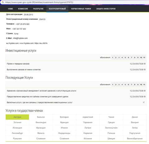 Перейдя на сайт регулятора CySEC, мы провели поиск, чтобы выяснить тот факт, что оффшорным мошенникам FxGlobe регулятор действительно выдал лицензию, однако действует она на ограниченном количестве стран, и соответственно если вы не являетесь их гражданином, то и на надежность надеяться не стоит. К тому же если и являетесь, то судиться вам придется на территории Кипра.