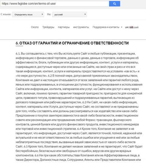 Далее в клиентском соглашении шулеров Фх Глоб следует отказ от ответственности за любые информационные данные, предоставленные у жуликов FxGlobe на сайте. Притом стоит учесть, что под понятие таких данных могут попадать и котировки на платформе, которые благодаря данному условию мошенники Фх Глоб могут крутить в абсолютно любую сторону.