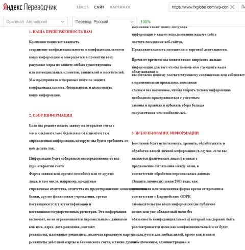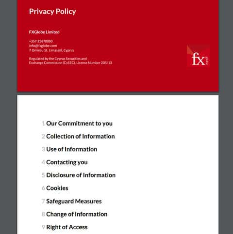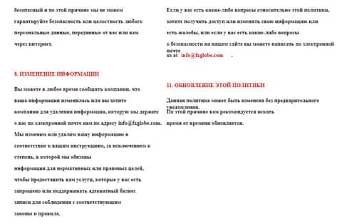 В отличии от условий сотрудничества политика конфиденциальности у шулеров Фх Глоб представлена в виде документа PDF формата, на который ведет ссылка с окончания сайта аферистов FxGlobe. Политика конфиденциальности у жуликов Фх Глоб представлена явно лучше, чем клиентское соглашение, имеет содержание. Увидеть ее внешний вид вы можете на изображении ниже.