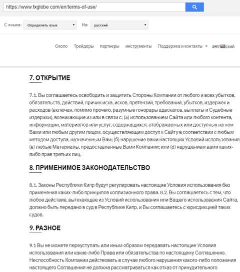 Ну в окончание данных условий шулера FxGlobe поместили условие того, что в случае каких-либо жалоб или претензий с вашей стороны, все судебные разбирательства будут происходить по законодательству оффшора, и на его территории, что сразу ставит клиента в невыгодное положение. На изображении ниже вы можете прочесть данный пункт условий аферистов.