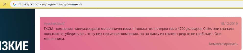 Негативный комментарий жертвы лохотрона FXGM на одном из интернет-ресурсов