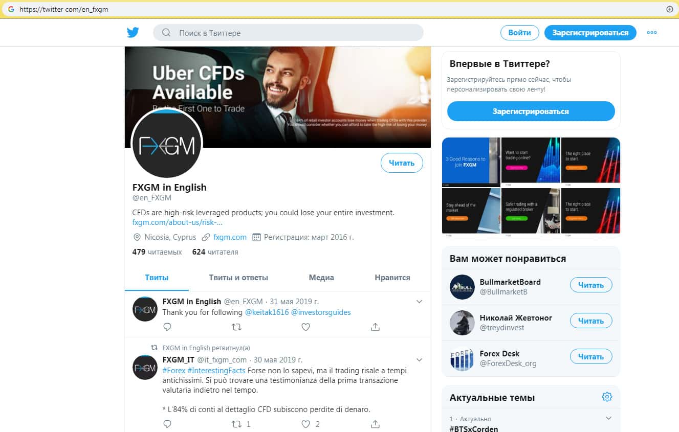 Дабы соответствовать современным трендам шулера FXGM создали себе страницы в социальных сетях, одной из которых является Твиттер, где у мошенников FXGM имеется менее тысячи подписчиков. На изображении, расположенном ниже, вы можете увидеть внешний вид страницы проходимцев в социальной сети Твиттер.